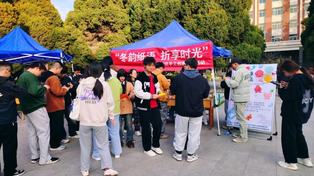 为丰富校园文化生活,传承中华优秀传统手工艺,电子与信息工程学院青年志愿者协会于2025年11月13日下午在图书馆前广场成功举办“冬韵纸语 折享时光”——剪纸、折纸手工创意趣味活动。活动现场气氛热烈,来自全校各院系的同学们齐聚一堂,以纸为媒,在指尖流转间感受传统技艺的独特魅力。