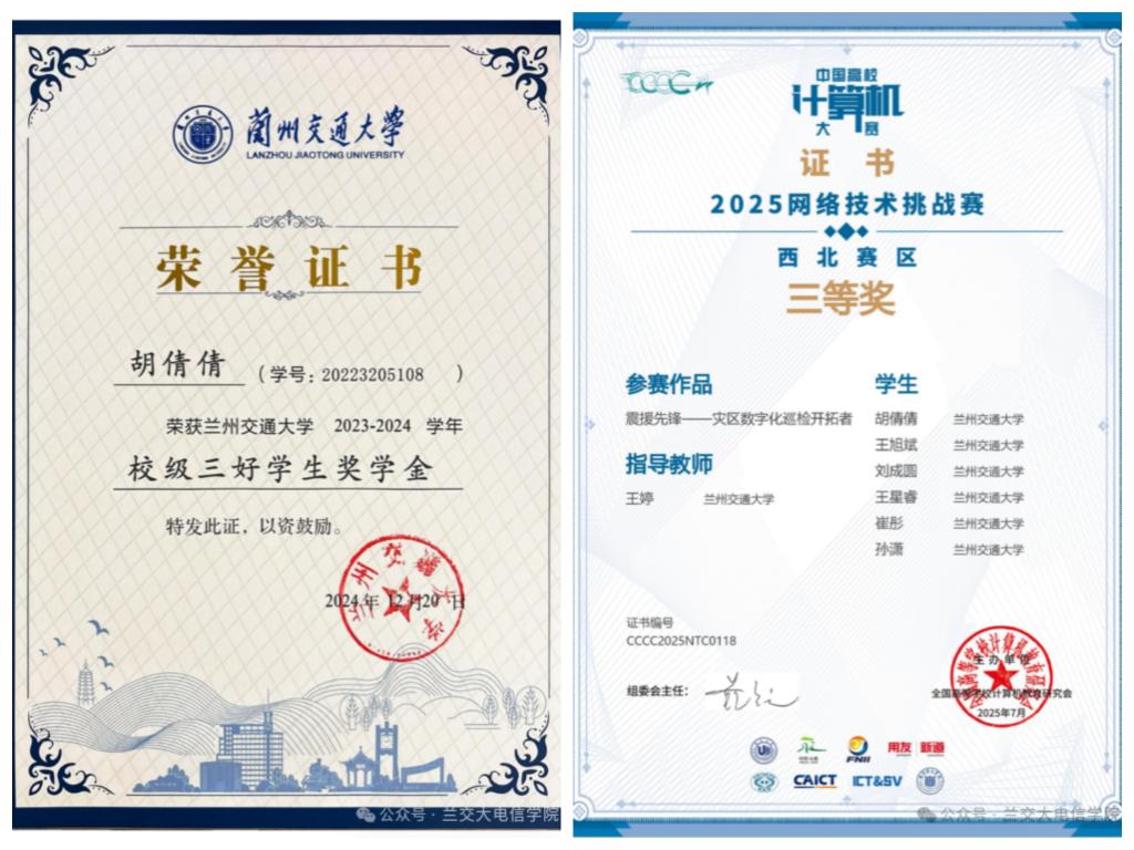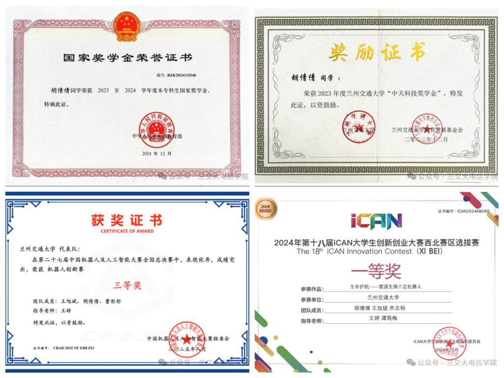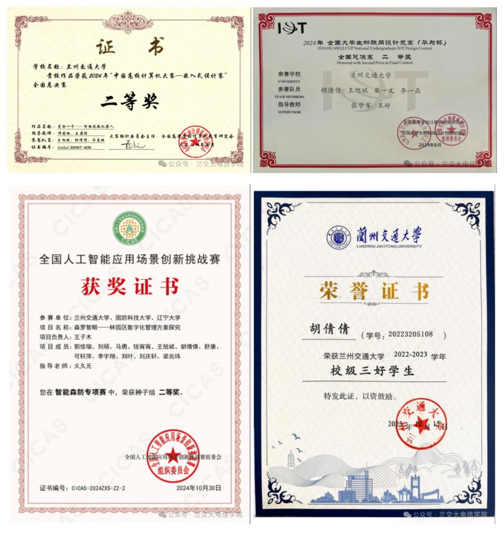 胡倩倩同学以连续三年专业第一的优异成绩,书写了一段充实而精彩的大学生活。作为一名信息类专业的工科生,她不仅在学业上精益求精,更在各类竞赛中屡获殊荣,展现出全面的综合素养。