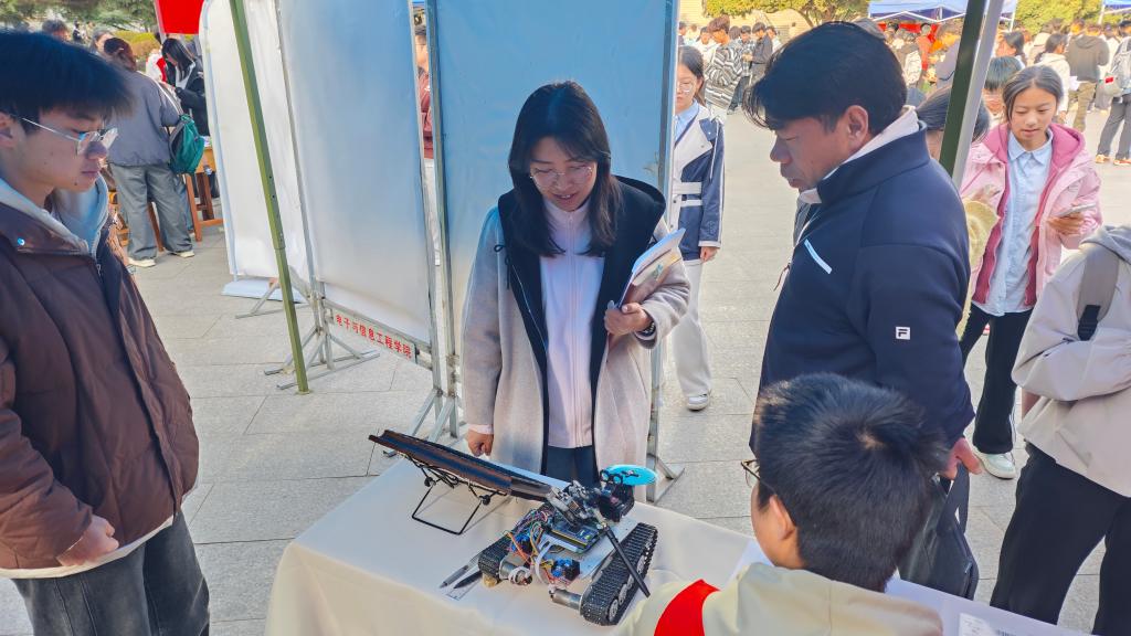 活动现场,作品按类别陈列于展板与展台上,每件展品均配有创作说明,清晰呈现作者的构思历程与精神表达。师生在自主观展的同时,通过手机扫码参与线上投票,实时更新的“我最喜爱的文创”热度榜有效激发了参与热情,现场气氛热烈、互动频繁。许多同学驻足于融合专业特色的展品前深入交流,纷纷表示:“用我们所学的电路板技术制作红色文创,既新颖又亲切,让红色精神在专业语境中变得更加可感可触。”