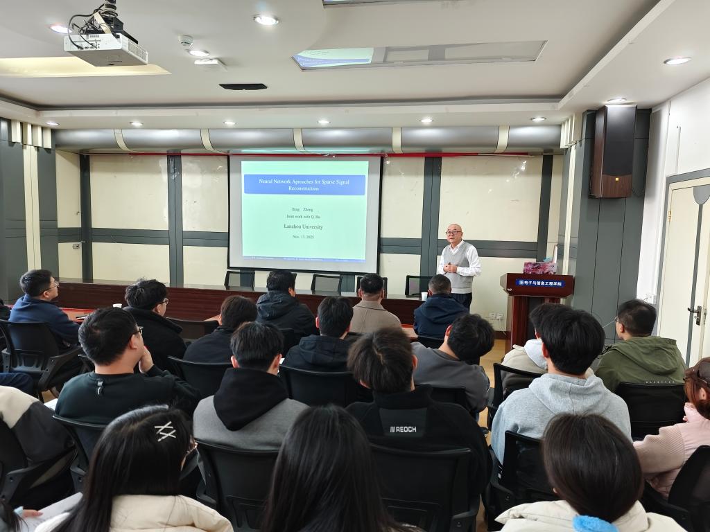 郑兵教授以“Neural Network Approaches for Sparse Signal Reconstruction”为题,详细阐述了梯度基神经网络(GNN)在无约束和约束优化问题中的应用原理、数学模型及电路架构,并针对稀疏信号重构的核心需求,分析了压缩感知框架下L1最小化替代L0最小化的合理性及相关理论条件。重点讲解了稀疏信号重构的各类神经网络模型,包括基于拉格朗日规划的神经网络(LPNN)、投影神经网络(PNN)及其有限时间(FPNN)、固定时间(FTPNN)改进版本,指出了现有模型在稳定性、收敛速度和抗噪性方面的不足,提出了变参数投影神经网络(VPPNN)和双层模糊变参数神经网络(TLFVPNN),通过设计时变参数矩阵和复合激活函数,实现了更快的收敛速度和更强的抗噪能力。