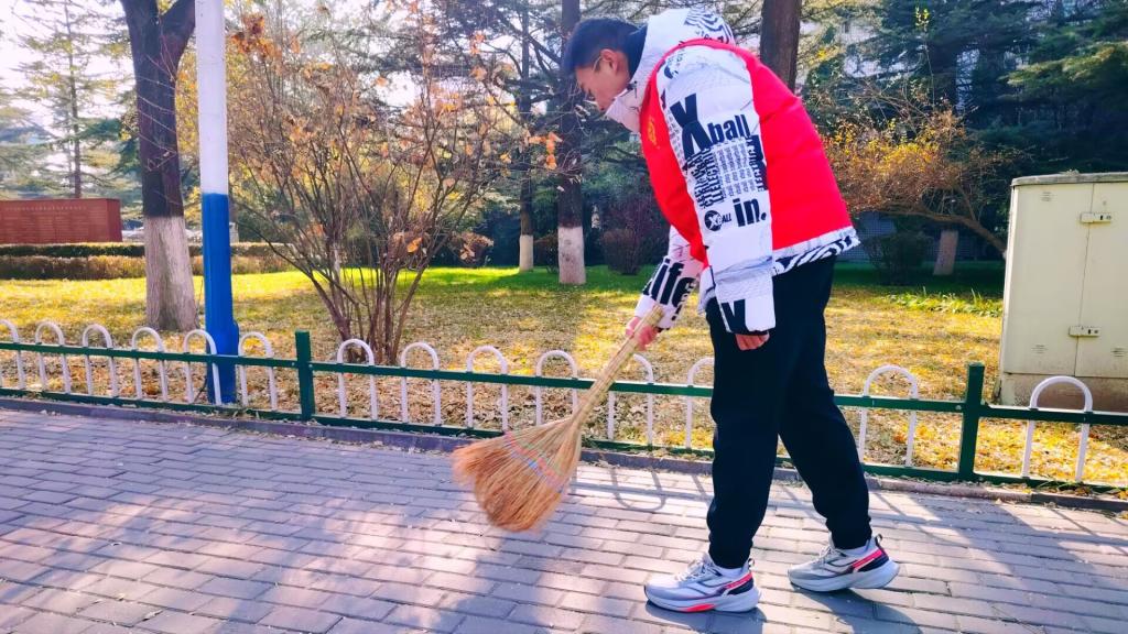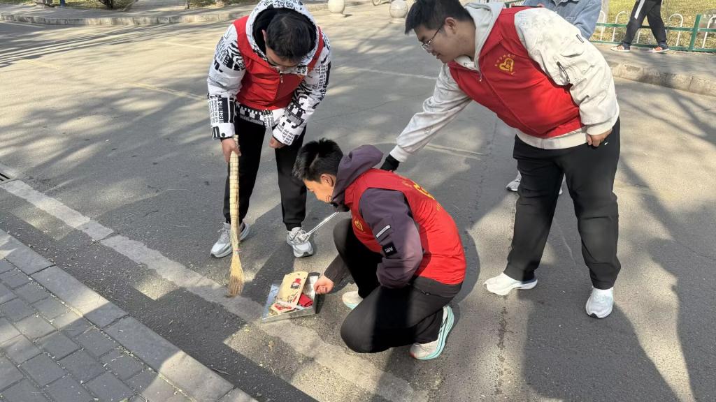 活动当日,志愿者们身着统一志愿服装,及时到场并按照前期分工情况开展清扫工作:一部分同学负责清理主干道路及绿化带中的落叶杂物,而在扫帚难以触及的区域或无法清洁的杂物,同学们用夹子辅助清理;一部分同学则主要擦拭尚德楼下的宣传栏玻璃,确保过往的师生清楚地获取信息;其余同学则负责将励志楼与其他楼宇之间乱停乱放的车辆摆放整齐。尽管天气寒冷,但大家相互配合、干劲十足。经过半个多小时的辛勤劳动,该区域的环境状况得到了有效改善。
